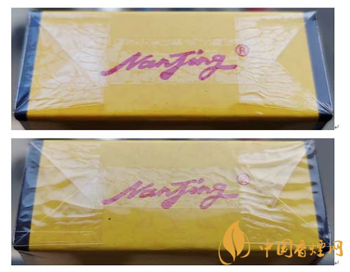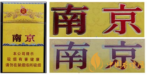 假冒卷烟:该款假冒卷烟南京字体边缘金色轮廓线和笔画内无小圆点,字体笔画颜色暗淡,烫金套印有偏差。图3上真下假