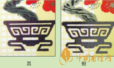 3.看“花盆”图案:真品卷烟的花盆为咖啡色,花盆底层的网格状纹路隐约可见;假冒卷烟的花盆大多为黑色,颜色较深,看不到花盆底层的网格状纹路。